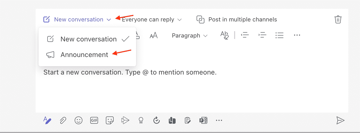 If you want to make a conversation really stand out, you can turn it into an announcement. Click the Format icon in the lower left of the message space. Then, at the top left of the message box, click the New conversation drop-down. Select Announcement.