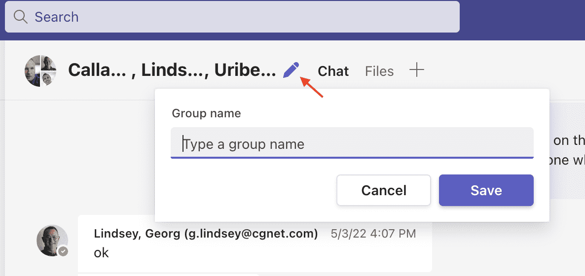 For example, if you already have a group of colleagues you go to lunch with every Tuesday, and you use chat to pick your destination, you could rename that group as “Tuesday Lunch Crew”. This will make it much easier to find them and continue the conversation when the next Tuesday rolls around. And maybe leave more time for the actual lunch!