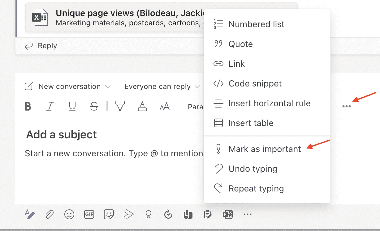 One other way to bring attention to your message in a channel conversation is to mark it as important. Once you post it, Teams will immediately alert the other people in the chat to read your message. They will be reminded to do so every two minutes for 20 minutes. Obviously, you should only use this function for a truly urgent matter.
