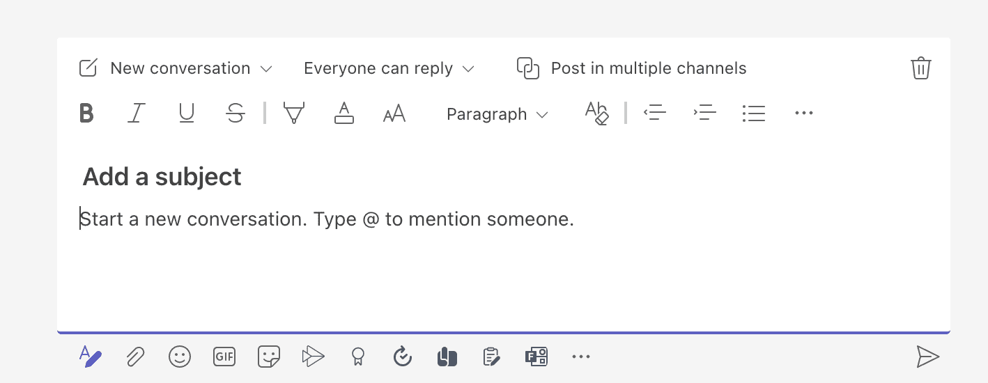 By default, everyone in a channel can reply to conversations, but you might not want that for an announcement. If you click the “Everyone can reply” drop-down at the top of the message composing window, select “You and moderators can reply” if you want to limit responses.